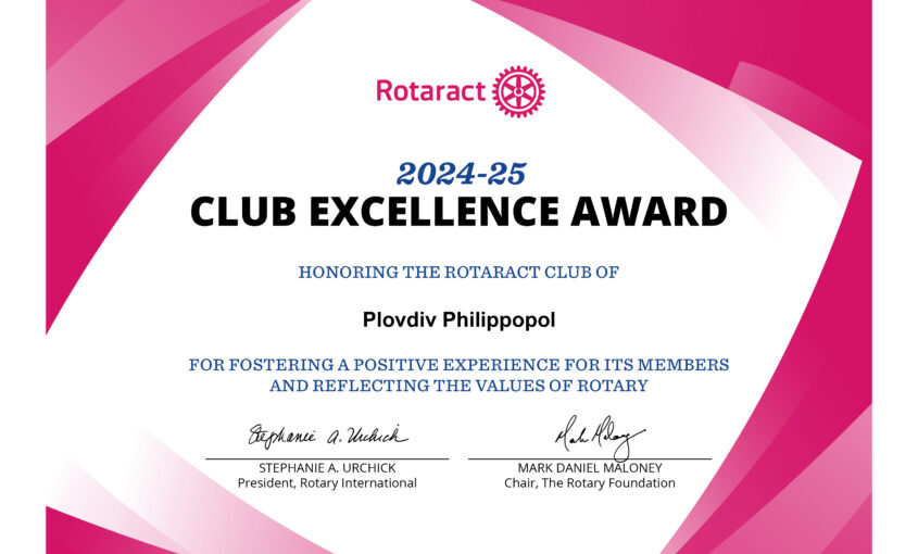 С гордост обявяваме, че Ротаракт клуб Пловдив – Филипопол беше удостоен с престижната международна награда Rotaract Club Excellence Award 2024–2025, присъждана от Rotary International. Това отличие се връчва на Ротаракт клубове по света, които изграждат вдъхновяваща и позитивна среда за своите членове и чрез своите проекти ясно отразяват ценностите на Ротари. През изминалата ротарианска година